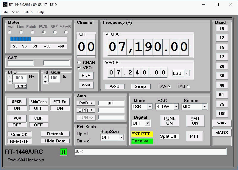 Release 0.962. Fixed problems that caused radio to crash in v0.961. Allows Split only when both frequencies are in USB, LSB, or AME. "Out of Band" limit now depends on the transmit VFO to allow transmitting so VFO A may be used to listen out of band. Note: If you want to transmit outside the Amateur Radio bands, you may add a file named "Permissions.txt" to the "RT1446 Files" folder. Added "Test" button to initiate radio self-test. Label under Test button will show "FAULT" if Self-Test fails or if fault occurs during operation. Program caption date: 11-21-17 : 1600.